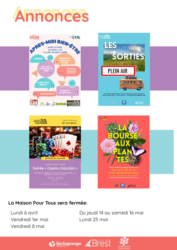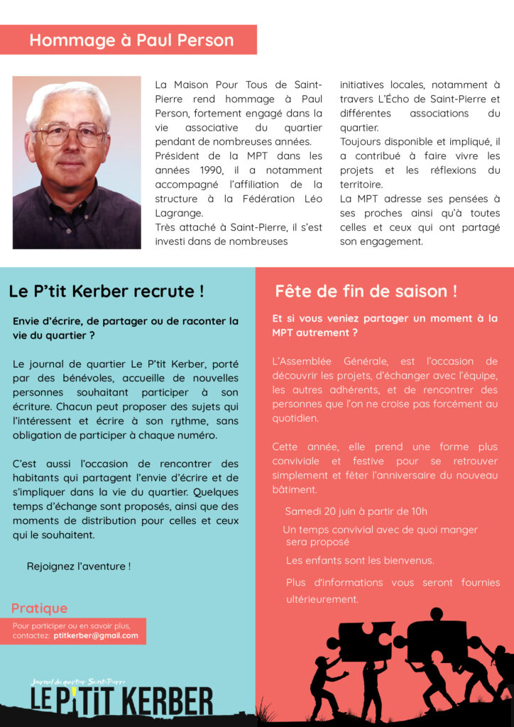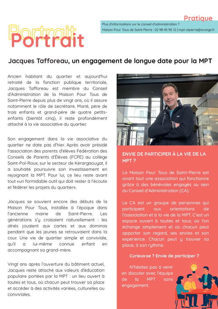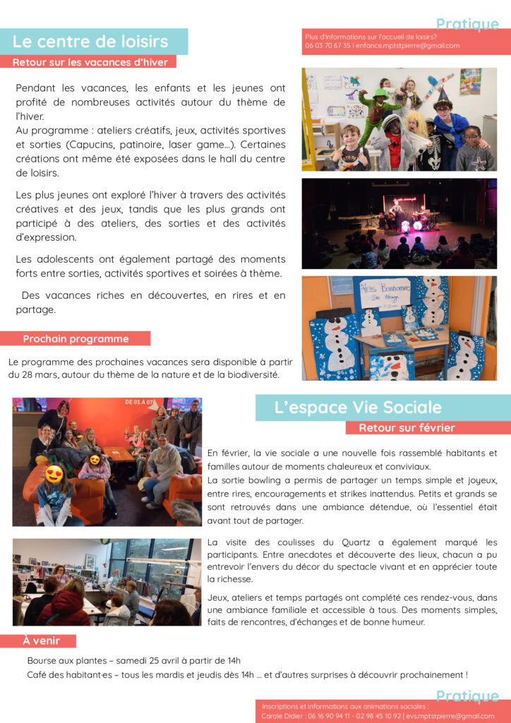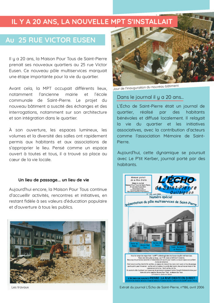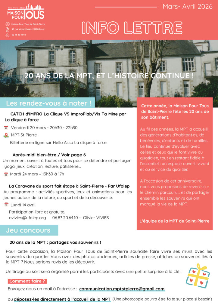 Actualités Infolettre Mars-Avril 24 février 2026 by MPT de saint Pierre in Actualités La nouvelle infolettre de mars-avril est disponible ! Dans ce numéro spécial vous retrouverez l’évolution de la Maison Pour Tous de Saint-Pierre qui fête les 20 ans de son nouveau bâtiment cette année. Bonne lecture ! 0 Comments 0 Like! Share